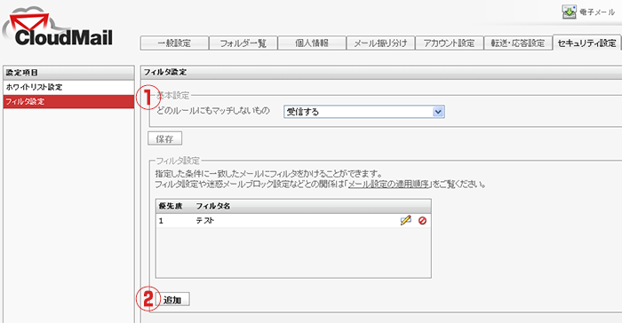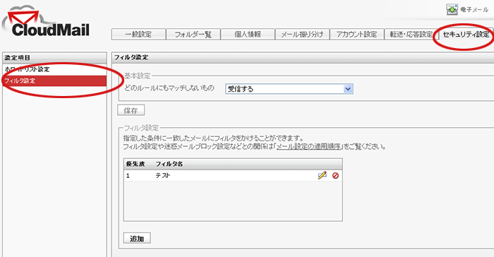 「セキュリティ設定」タブをクリックし、左メニューから、『フィルタ設定』を押します。
