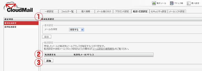 ●転送先メールアドレス→デフォルトの転送先メールアドレスを指定します。
