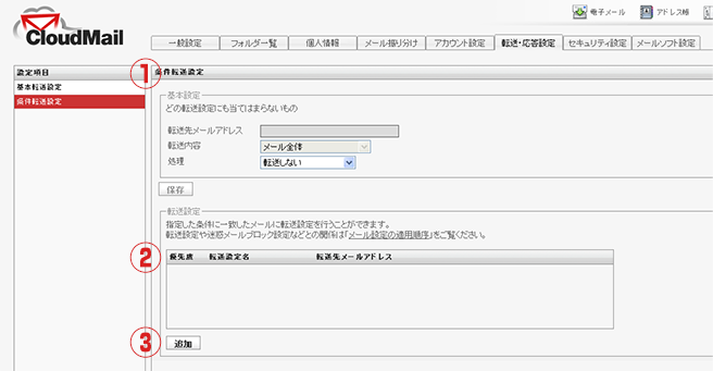 Webメールから、様々な条件をつけて、最大20箇所までの転送設定を行う事ができます。