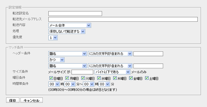 | 転送内容 | 条件に一致した場合転送する内容を次のうちから選択します。 ・メール全体 ・ヘッダーのみ ・ヘッダーと本文の先頭から-行のみ |
